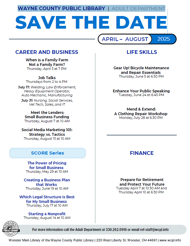 Read MoreWAYNE COUNTY PUBLIC LIBRARY | ADULT DEPARTMENT April to August Save the Date
